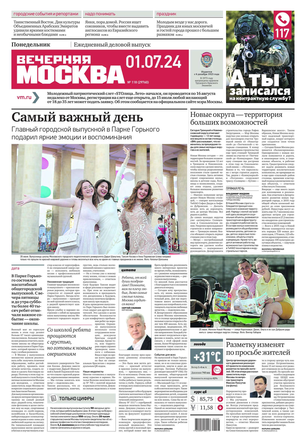 «Вечерняя Москва» — ежедневная российская вечерняя газета, старейшее из вечерних изданий в России, учрежденное в 1923 году. Выходит пять дней в неделю, кроме субботы и воскресенья. Отличается тем, что рассказывает о событиях еще не завершившегося дня. Оперативно освещает хронику и особенности жизни Москвы, охватывает все слои общества и большинство профессиональных и возрастных групп читателей.Издание представлено тремя выпусками – утренним ежедневным, вечерним (выходит три раза в неделю), еженедельным (выходит по четвергам).
