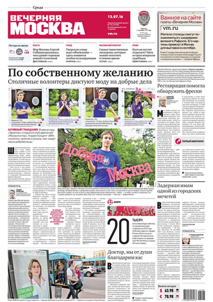 «Вечерняя Москва» — ежедневная российская вечерняя газета, старейшее из вечерних изданий в России, учрежденное в 1923 году. Выходит пять дней в неделю, кроме субботы и воскресенья. Отличается тем, что рассказывает о событиях еще не завершившегося дня. Оперативно освещает хронику и особенности жизни Москвы, охватывает все слои общества и большинство профессиональных и возрастных групп читателей.Издание представлено тремя выпусками – утренним ежедневным, вечерним (выходит три раза в неделю), еженедельным (выходит по четвергам).