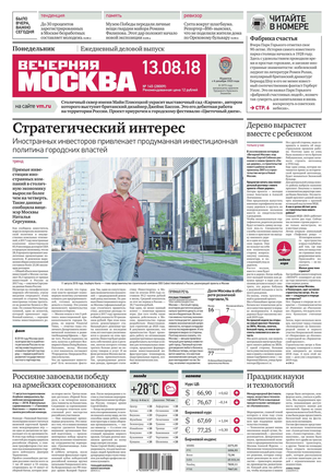 «Вечерняя Москва» — ежедневная российская вечерняя газета, старейшее из вечерних изданий в России, учрежденное в 1923 году. Выходит пять дней в неделю, кроме субботы и воскресенья. Отличается тем, что рассказывает о событиях еще не завершившегося дня. Оперативно освещает хронику и особенности жизни Москвы, охватывает все слои общества и большинство профессиональных и возрастных групп читателей.Издание представлено тремя выпусками – утренним ежедневным, вечерним (выходит три раза в неделю), еженедельным (выходит по четвергам).