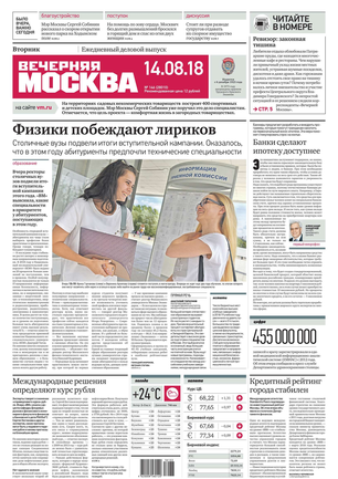 «Вечерняя Москва» — ежедневная российская вечерняя газета, старейшее из вечерних изданий в России, учрежденное в 1923 году. Выходит пять дней в неделю, кроме субботы и воскресенья. Отличается тем, что рассказывает о событиях еще не завершившегося дня. Оперативно освещает хронику и особенности жизни Москвы, охватывает все слои общества и большинство профессиональных и возрастных групп читателей.Издание представлено тремя выпусками – утренним ежедневным, вечерним (выходит три раза в неделю), еженедельным (выходит по четвергам).