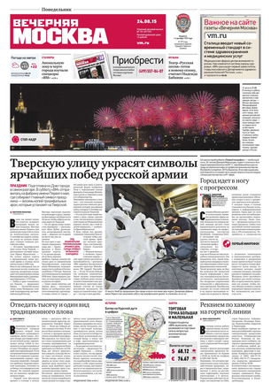 «Вечерняя Москва» — ежедневная российская вечерняя газета, старейшее из вечерних изданий в России, учрежденное в 1923 году. Выходит пять дней в неделю, кроме субботы и воскресенья. Отличается тем, что рассказывает о событиях еще не завершившегося дня. Оперативно освещает хронику и особенности жизни Москвы, охватывает все слои общества и большинство профессиональных и возрастных групп читателей.Издание представлено тремя выпусками – утренним ежедневным, вечерним (выходит три раза в неделю), еженедельным (выходит по четвергам).