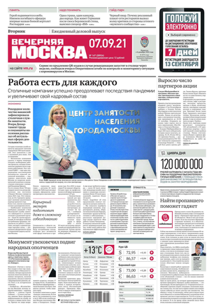 «Вечерняя Москва» — ежедневная российская вечерняя газета, старейшее из вечерних изданий в России, учрежденное в 1923 году. Выходит пять дней в неделю, кроме субботы и воскресенья. Отличается тем, что рассказывает о событиях еще не завершившегося дня. Оперативно освещает хронику и особенности жизни Москвы, охватывает все слои общества и большинство профессиональных и возрастных групп читателей.Издание представлено тремя выпусками – утренним ежедневным, вечерним (выходит три раза в неделю), еженедельным (выходит по четвергам).