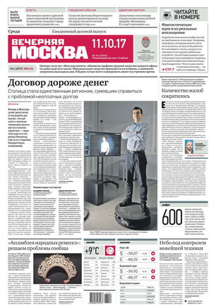 «Вечерняя Москва» — ежедневная российская вечерняя газета, старейшее из вечерних изданий в России, учрежденное в 1923 году. Выходит пять дней в неделю, кроме субботы и воскресенья. Отличается тем, что рассказывает о событиях еще не завершившегося дня. Оперативно освещает хронику и особенности жизни Москвы, охватывает все слои общества и большинство профессиональных и возрастных групп читателей.Издание представлено тремя выпусками – утренним ежедневным, вечерним (выходит три раза в неделю), еженедельным (выходит по четвергам).