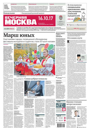«Вечерняя Москва» — ежедневная российская вечерняя газета, старейшее из вечерних изданий в России, учрежденное в 1923 году. Выходит пять дней в неделю, кроме субботы и воскресенья. Отличается тем, что рассказывает о событиях еще не завершившегося дня. Оперативно освещает хронику и особенности жизни Москвы, охватывает все слои общества и большинство профессиональных и возрастных групп читателей.Издание представлено тремя выпусками – утренним ежедневным, вечерним (выходит три раза в неделю), еженедельным (выходит по четвергам).