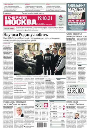 «Вечерняя Москва» — ежедневная российская вечерняя газета, старейшее из вечерних изданий в России, учрежденное в 1923 году. Выходит пять дней в неделю, кроме субботы и воскресенья. Отличается тем, что рассказывает о событиях еще не завершившегося дня. Оперативно освещает хронику и особенности жизни Москвы, охватывает все слои общества и большинство профессиональных и возрастных групп читателей.Издание представлено тремя выпусками – утренним ежедневным, вечерним (выходит три раза в неделю), еженедельным (выходит по четвергам).