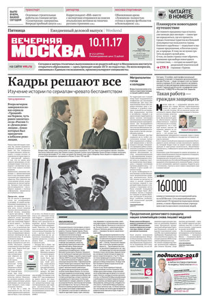 «Вечерняя Москва» — ежедневная российская вечерняя газета, старейшее из вечерних изданий в России, учрежденное в 1923 году. Выходит пять дней в неделю, кроме субботы и воскресенья. Отличается тем, что рассказывает о событиях еще не завершившегося дня. Оперативно освещает хронику и особенности жизни Москвы, охватывает все слои общества и большинство профессиональных и возрастных групп читателей.Издание представлено тремя выпусками – утренним ежедневным, вечерним (выходит три раза в неделю), еженедельным (выходит по четвергам).
