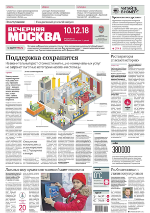 «Вечерняя Москва» — ежедневная российская вечерняя газета, старейшее из вечерних изданий в России, учрежденное в 1923 году. Выходит пять дней в неделю, кроме субботы и воскресенья. Отличается тем, что рассказывает о событиях еще не завершившегося дня. Оперативно освещает хронику и особенности жизни Москвы, охватывает все слои общества и большинство профессиональных и возрастных групп читателей.Издание представлено тремя выпусками – утренним ежедневным, вечерним (выходит три раза в неделю), еженедельным (выходит по четвергам).