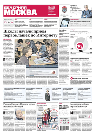 «Вечерняя Москва» — ежедневная российская вечерняя газета, старейшее из вечерних изданий в России, учрежденное в 1923 году. Выходит пять дней в неделю, кроме субботы и воскресенья. Отличается тем, что рассказывает о событиях еще не завершившегося дня. Оперативно освещает хронику и особенности жизни Москвы, охватывает все слои общества и большинство профессиональных и возрастных групп читателей.Издание представлено тремя выпусками – утренним ежедневным, вечерним (выходит три раза в неделю), еженедельным (выходит по четвергам).