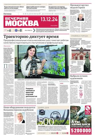 «Вечерняя Москва» — ежедневная российская вечерняя газета, старейшее из вечерних изданий в России, учрежденное в 1923 году. Выходит пять дней в неделю, кроме субботы и воскресенья. Отличается тем, что рассказывает о событиях еще не завершившегося дня. Оперативно освещает хронику и особенности жизни Москвы, охватывает все слои общества и большинство профессиональных и возрастных групп читателей.Издание представлено тремя выпусками – утренним ежедневным, вечерним (выходит три раза в неделю), еженедельным (выходит по четвергам).