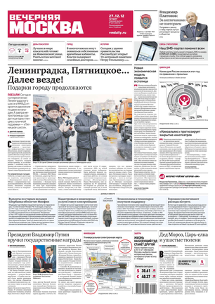 «Вечерняя Москва» — ежедневная российская вечерняя газета, старейшее из вечерних изданий в России, учрежденное в 1923 году. Выходит пять дней в неделю, кроме субботы и воскресенья. Отличается тем, что рассказывает о событиях еще не завершившегося дня. Оперативно освещает хронику и особенности жизни Москвы, охватывает все слои общества и большинство профессиональных и возрастных групп читателей.Издание представлено тремя выпусками – утренним ежедневным, вечерним (выходит три раза в неделю), еженедельным (выходит по четвергам).