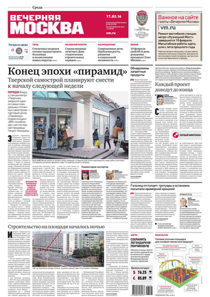 «Вечерняя Москва» — ежедневная российская вечерняя газета, старейшее из вечерних изданий в России, учрежденное в 1923 году. Выходит пять дней в неделю, кроме субботы и воскресенья. Отличается тем, что рассказывает о событиях еще не завершившегося дня. Оперативно освещает хронику и особенности жизни Москвы, охватывает все слои общества и большинство профессиональных и возрастных групп читателей.Издание представлено тремя выпусками – утренним ежедневным, вечерним (выходит три раза в неделю), еженедельным (выходит по четвергам).