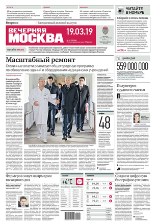 «Вечерняя Москва» — ежедневная российская вечерняя газета, старейшее из вечерних изданий в России, учрежденное в 1923 году. Выходит пять дней в неделю, кроме субботы и воскресенья. Отличается тем, что рассказывает о событиях еще не завершившегося дня. Оперативно освещает хронику и особенности жизни Москвы, охватывает все слои общества и большинство профессиональных и возрастных групп читателей.Издание представлено тремя выпусками – утренним ежедневным, вечерним (выходит три раза в неделю), еженедельным (выходит по четвергам).