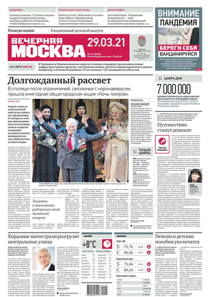 «Вечерняя Москва» — ежедневная российская вечерняя газета, старейшее из вечерних изданий в России, учрежденное в 1923 году. Выходит пять дней в неделю, кроме субботы и воскресенья. Отличается тем, что рассказывает о событиях еще не завершившегося дня. Оперативно освещает хронику и особенности жизни Москвы, охватывает все слои общества и большинство профессиональных и возрастных групп читателей.Издание представлено тремя выпусками – утренним ежедневным, вечерним (выходит три раза в неделю), еженедельным (выходит по четвергам).