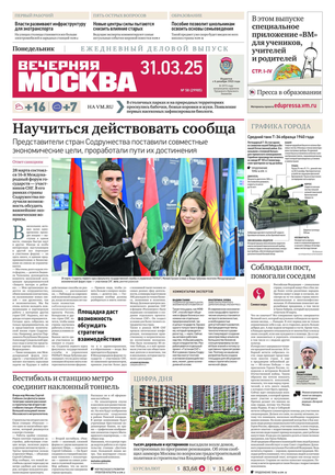 «Вечерняя Москва» — ежедневная российская вечерняя газета, старейшее из вечерних изданий в России, учрежденное в 1923 году. Выходит пять дней в неделю, кроме субботы и воскресенья. Отличается тем, что рассказывает о событиях еще не завершившегося дня. Оперативно освещает хронику и особенности жизни Москвы, охватывает все слои общества и большинство профессиональных и возрастных групп читателей.Издание представлено тремя выпусками – утренним ежедневным, вечерним (выходит три раза в неделю), еженедельным (выходит по четвергам).