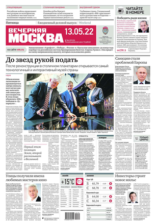 «Вечерняя Москва» — ежедневная российская вечерняя газета, старейшее из вечерних изданий в России, учрежденное в 1923 году. Выходит пять дней в неделю, кроме субботы и воскресенья. Отличается тем, что рассказывает о событиях еще не завершившегося дня. Оперативно освещает хронику и особенности жизни Москвы, охватывает все слои общества и большинство профессиональных и возрастных групп читателей.Издание представлено тремя выпусками – утренним ежедневным, вечерним (выходит три раза в неделю), еженедельным (выходит по четвергам).