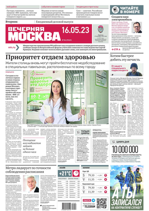 «Вечерняя Москва» — ежедневная российская вечерняя газета, старейшее из вечерних изданий в России, учрежденное в 1923 году. Выходит пять дней в неделю, кроме субботы и воскресенья. Отличается тем, что рассказывает о событиях еще не завершившегося дня. Оперативно освещает хронику и особенности жизни Москвы, охватывает все слои общества и большинство профессиональных и возрастных групп читателей.Издание представлено тремя выпусками – утренним ежедневным, вечерним (выходит три раза в неделю), еженедельным (выходит по четвергам).
