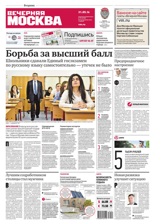 «Вечерняя Москва» — ежедневная российская вечерняя газета, старейшее из вечерних изданий в России, учрежденное в 1923 году. Выходит пять дней в неделю, кроме субботы и воскресенья. Отличается тем, что рассказывает о событиях еще не завершившегося дня. Оперативно освещает хронику и особенности жизни Москвы, охватывает все слои общества и большинство профессиональных и возрастных групп читателей.Издание представлено тремя выпусками – утренним ежедневным, вечерним (выходит три раза в неделю), еженедельным (выходит по четвергам).
